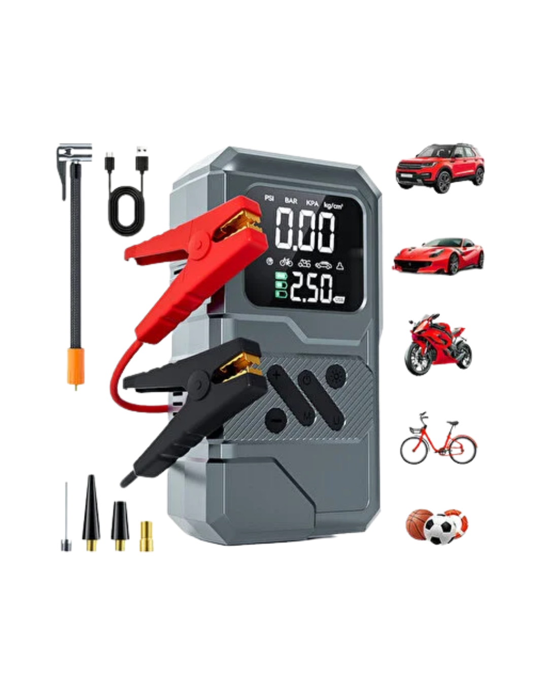 Akü takviye özelliği, özellikle beklenmedik akü bitmesi durumlarında sürücüye hızlı bir çözüm sunar. 12V araç sistemleriyle uyumlu yapısı sayesinde kullanıcıyı yolda kalma riskine karşı destekler. Hava kompresörü fonksiyonu, araç lastikleri başta olmak üzere bisiklet, top ve çeşitli şişme ürünlerin kolayca şişirilmesine yardımcı olur. Güçlü basınç kapasitesi ve dijital göstergesi sayesinde lastik basıncı kontrollü ve güvenli şekilde ayarlanabilir.