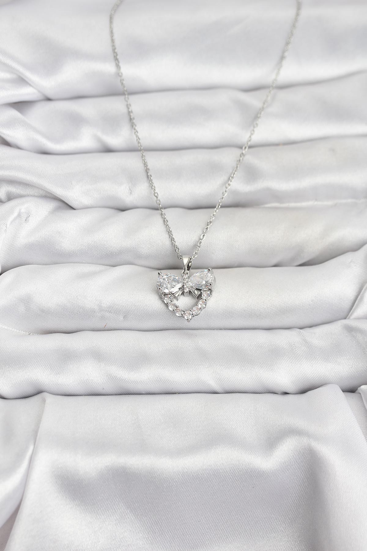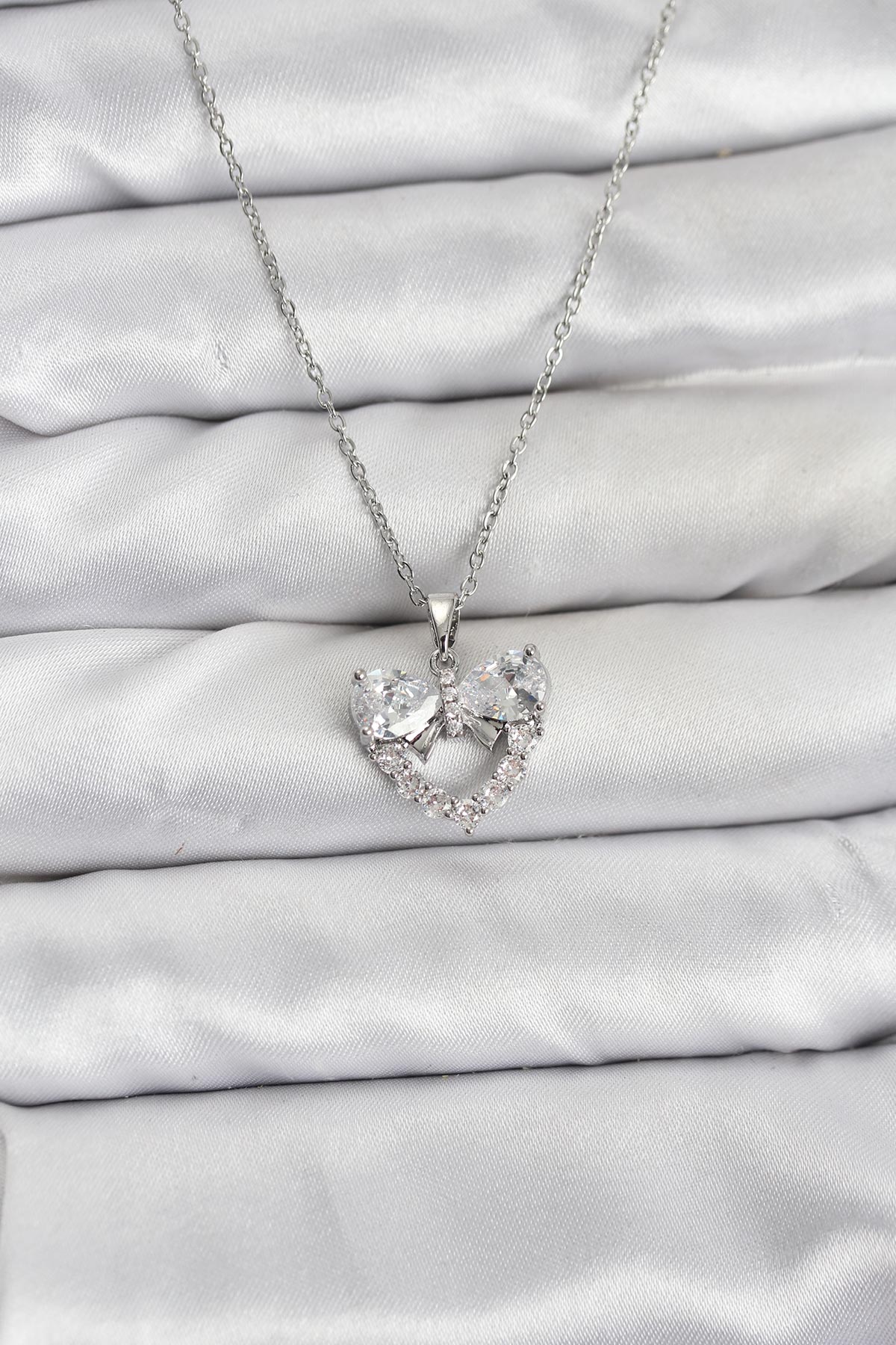 316L Çelik Zincir Gümüş Renk Kalp ve Fiyonk Model Zirkon Taşlı Kadın Kolye – Lisinya