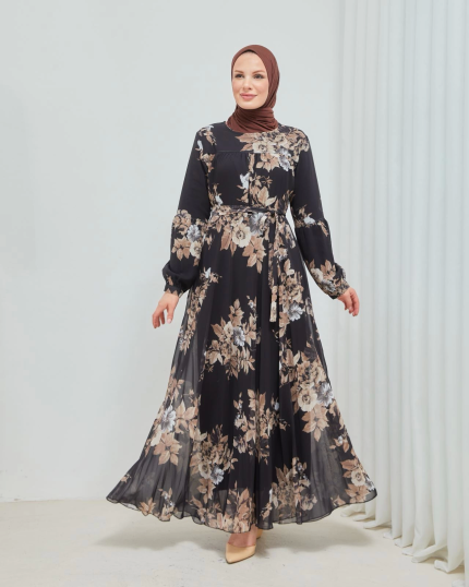 Yaprak Desenli Zarif ve Şık Uzun Boy Büyük Beden Astarlı Şifon Elbise