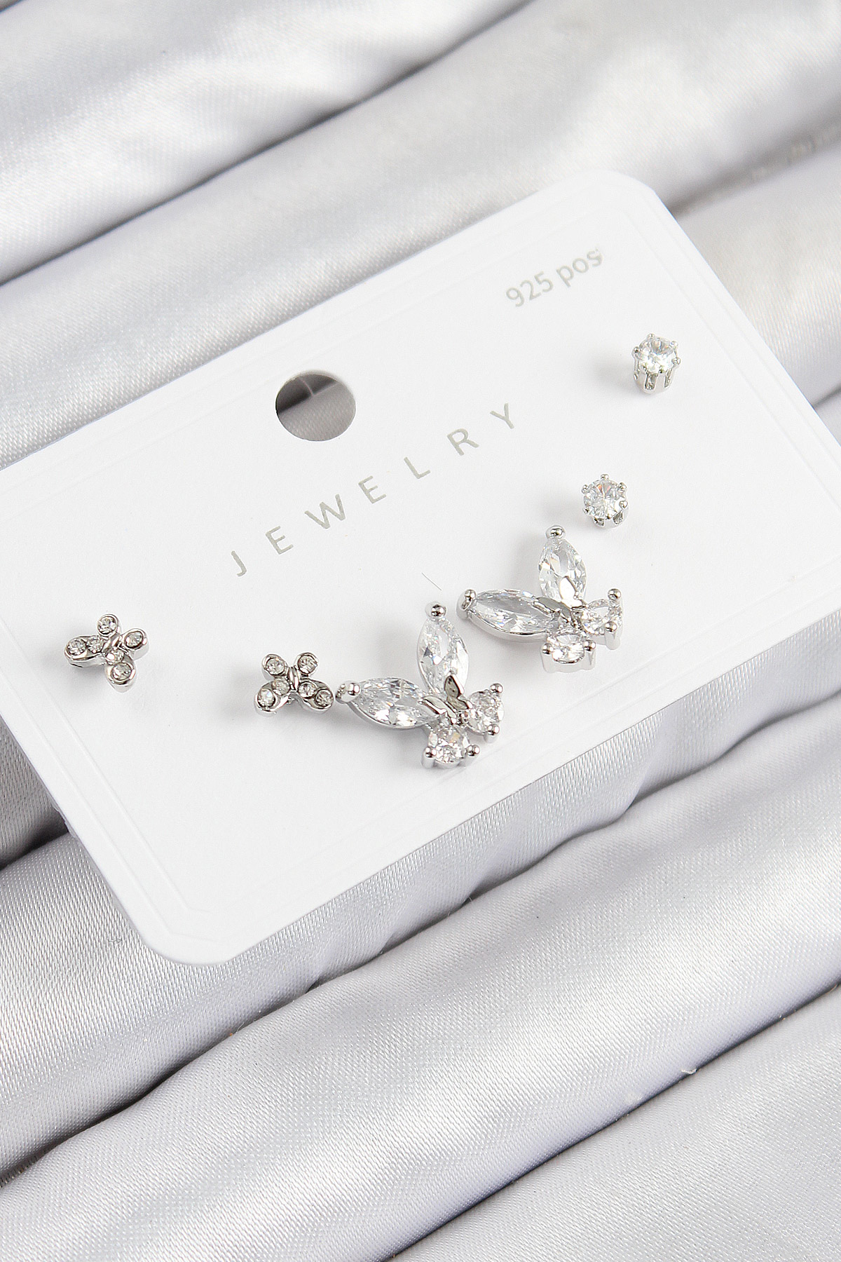 Pirinç Zirkon Taşlı Kelebek Model Gümüş Renk 925 Ayar Gümüş Çivi Kadın Küpe Set – Lisinya