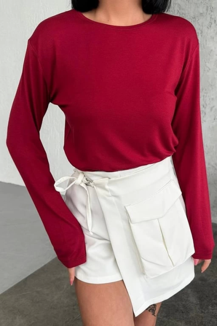 Rahat Ve Şık Uzun Kollu Bisiklet Yaka Likralı Viskon Penye Body Bordo ( Lisinya )